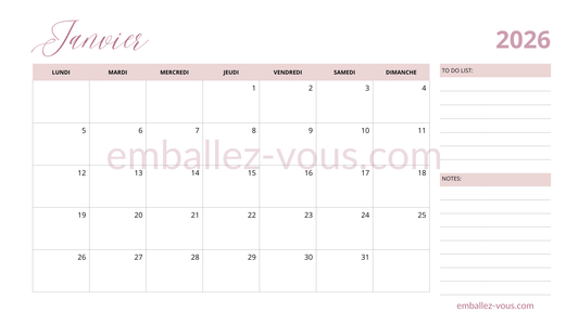 Calendrier mensuel 2026 - format PDF à imprimer