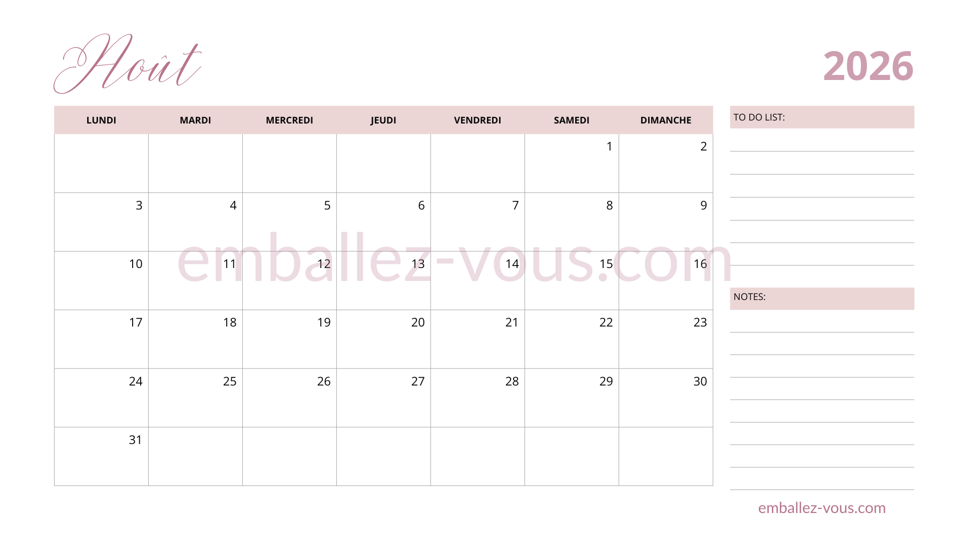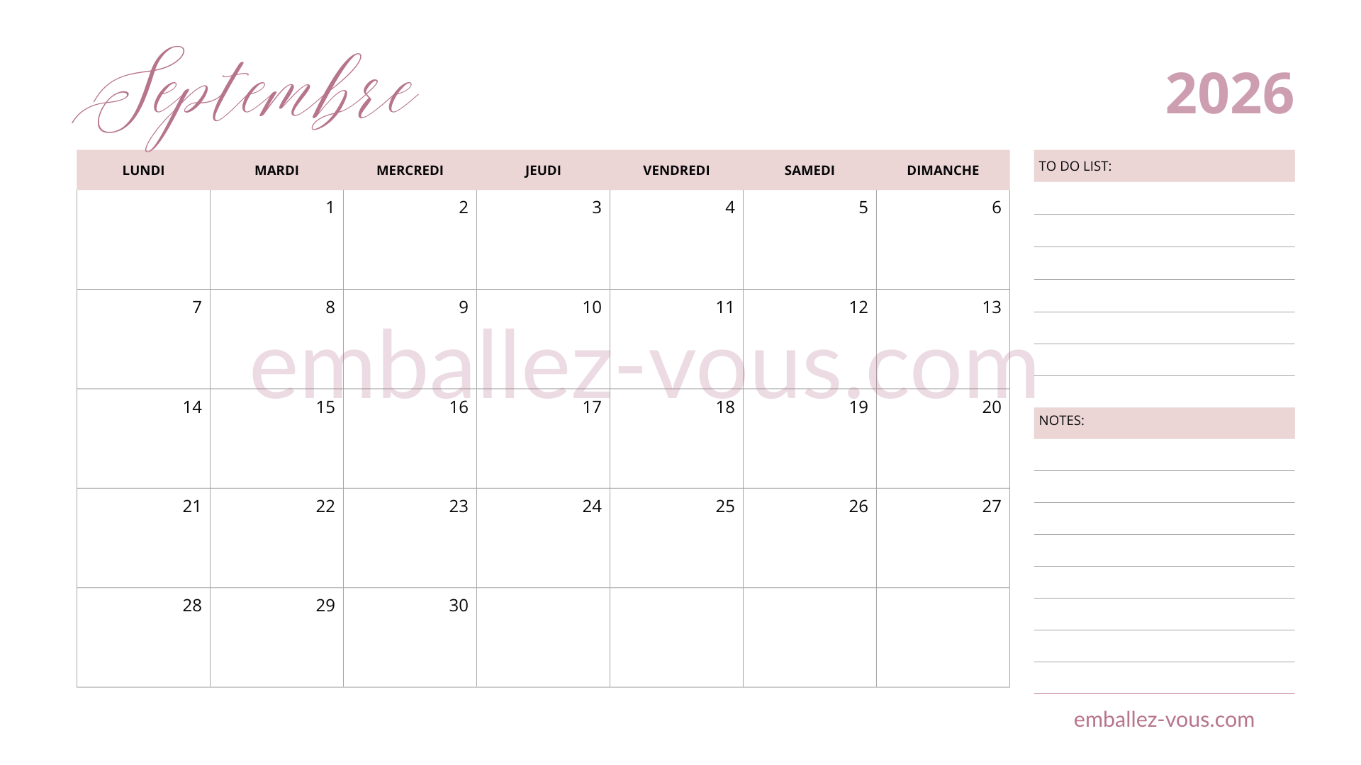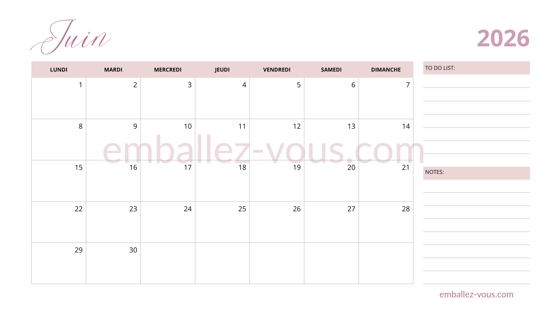 Calendrier mensuel numérique 2026 - format PDF à imprimer de chez vous. Une fois votre commande passée, vous recevrez un e-mail avec le document à télécharger.